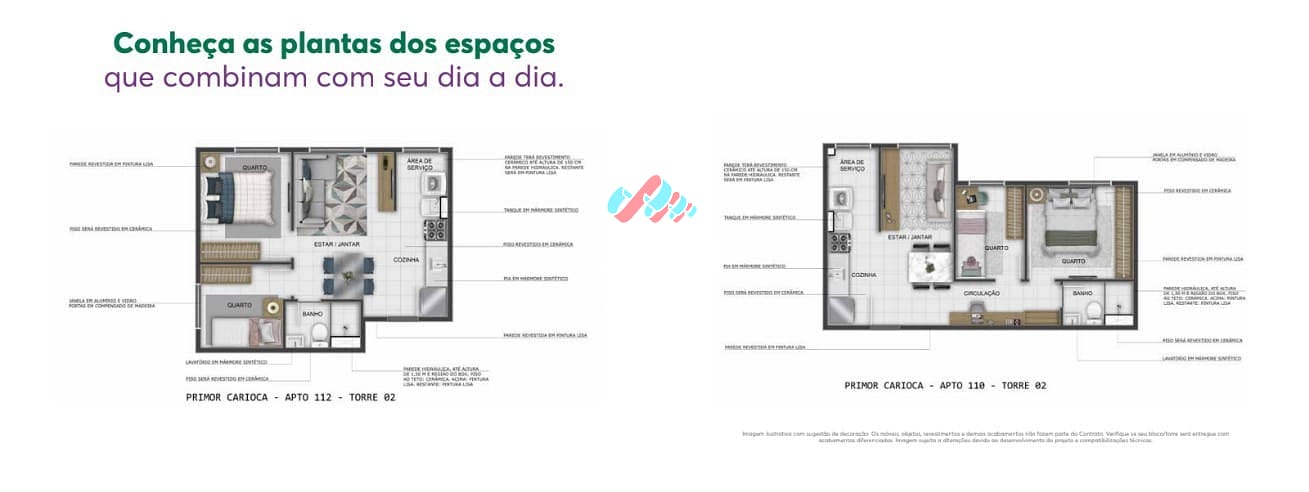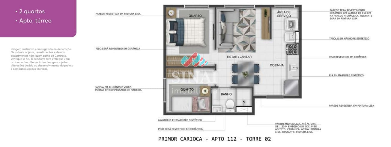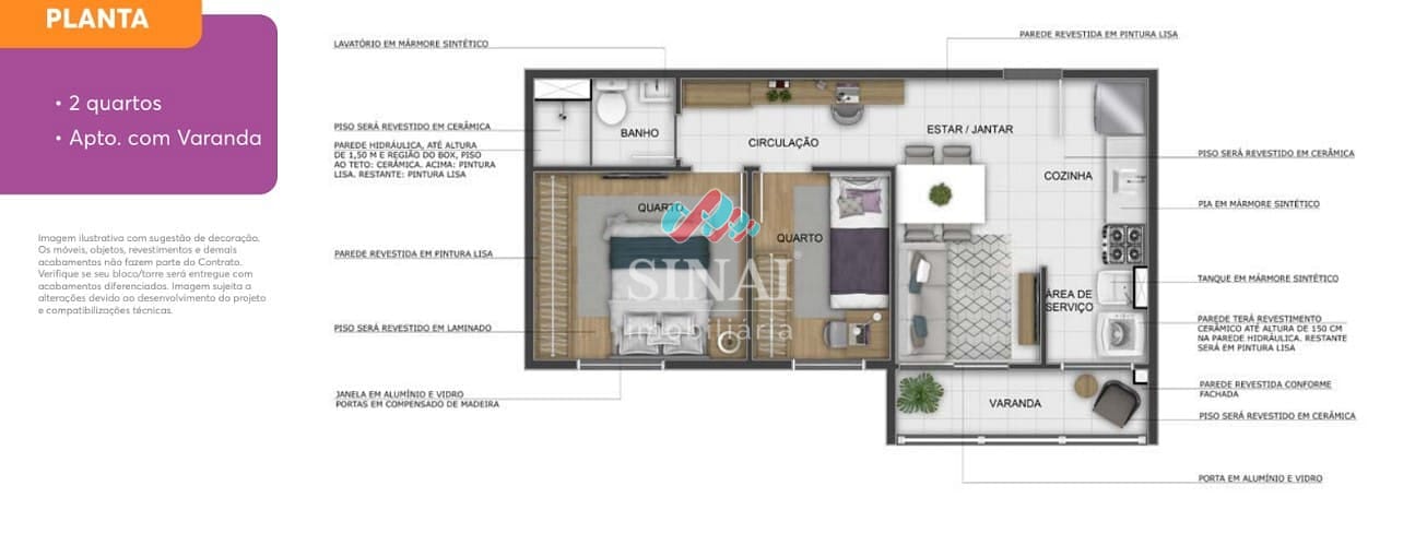 Diferenciais de acabamento & infraestrutura: Bancadas em mármore sintético na cozinha e banheiro, pisos laminados nos quartos, previsão para ar-condicionado, medição individualizada de água e gás.
